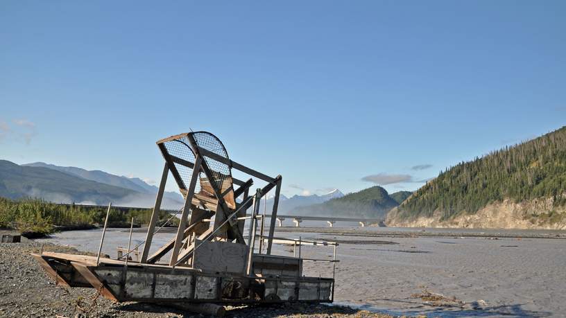 Na het ontbijt in Hotel Chitina, een voormalig bordeel, is het tijd om te vertrekken naar de wildernis van Wrangell St. Elias NP. De vorige keer dat ik hier was reisde ik per bushplane, deze keer dus per bus. Net na Chitina stoppen we bij de Copper River, waar lokale vissers met hun fish wheels zalm proberen te vangen. Ik herinner me nog de Copper River Red Salmon die ik ooit at, niet te versmaden! De vissers vertellen graag over hun leven in Alaska en laten hun materiaal en vangst zien. Dit alles onder het toeziend oog van met sneeuw bedekte vulkanen die in de verte opdoemen.