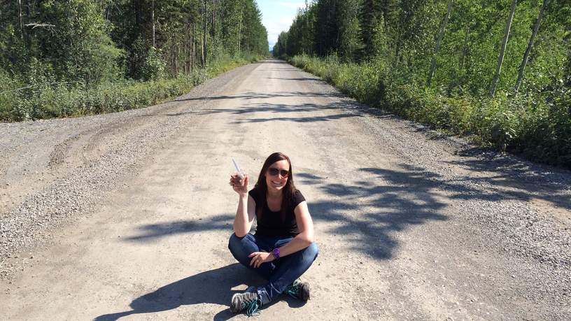 De weg hobbelt en doorkruist bijzonder fraaie landschappen. De oude spoorlijn duikt zo her en der nog op door het wegdek heen en dan ineens is er een hutje aan de rechterkant van de weg. Tijd voor koffie en ijs! Heel toepasselijk bestel ik een ‘Rocky Road’ ijsje: chocolade ijs met kleine marshmellows erin, heerlijk! Het is inmiddels lekker warm en hiermee doe ik de vaak gehoorde opmerking ‘het is toch altijd koud in Alaska’ te niet. In mijn t-shirt geniet ik van de zon op het ‘terras’ oftewel een oude, verrotte picknick bank. You just gotta love Alaska!