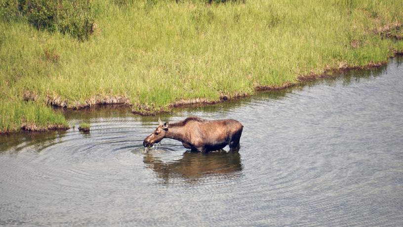 De Denali Highway maakt het mogelijk om door het Alaskaanse binnenland te reizen van pak ‘em beet Cantwell naar Paxson. Op deze manier sla je Fairbanks over, het bespaart je een dag rijden. Beide plaatsjes zijn niet meer dan een stip op de landkaart en bestaan uit slechts een handjevol gebouwen. Bij Denali Village kopen we nog snel een kop koffie en een broodje en niet veel later is het hobbelen geslagen. Gelukkig is het een relatief droge periode en is de weg in prima staat. De fireweed staat al deels in bloei en af en toe prikt de zon door het wolkendek. De reisleider bestuurt de bus met trailer behendig over de Denali Highway. Ineens zien we een busje aan de linkerkant stil staan, het blijkt dat er een eland met jong in een meertje langs de kant van de weg staat. Ogenschijnlijk trekt ze zich weinig van ons aan en duikt af en toe met haar kop onder water op zoek naar voedsel. Iedereen krijgt de kans om foto’s te maken en niet veel later vervolgen we onze weg.