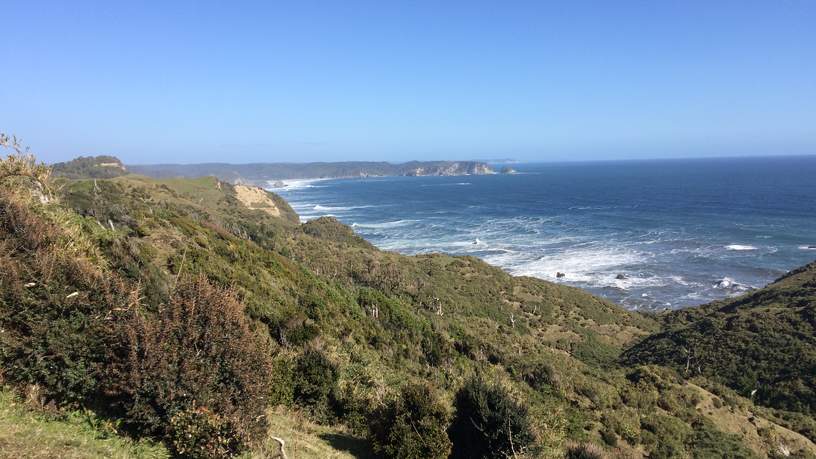 Het eerste deel van de trail voert me door een bos met glibberige paden. Na een half uur lopen kom ik het bos uit en ontvouwt zich voor het eerst dit deel van de oceaan voor me. Nog iets verder kom ik in een grasland en niet veel later sta ik bij Punta Purilil met een prachtig panorama over de Grote Oceaan. De wind wappert door mijn haar en ondanks dat de zon schijnt voel ik een rilling over mijn rug lopen. Man, wat is het mooi hier …