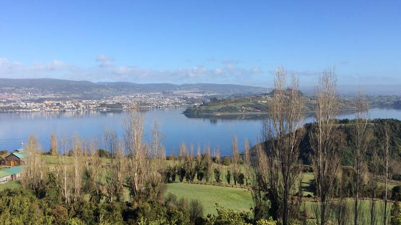 Ik had me eigenlijk geen voorstelling gemaakt van het landschap van Chiloé. De één die ik spreek vindt het geweldig, de ander vindt het saai. Ik besloot me dus te laten verrassen en me er vooral niet te veel van voor te stellen, het zou dan alleen maar kunnen tegenvallen. Net voor ik het hotel bereik, belt David van Protours me op, of ik al gearriveerd ben. Terwijl ik mijn Toyota RAV4 bijna de berm in stuur op de onverharde weg, geeft hij me de laatste aanwijzingen hoe ik bij het hotel moet komen. Vanaf de verharde weg is het nog een aantal kilometer over landweggetjes naar het hotel en niet veel later ben ik gearriveerd.
