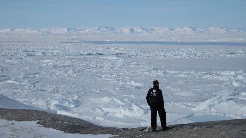 Net voor een helikopter de idyllische stilte komt verstoren, beginnen in het dorp de husky’s te huilen. Terug in het hotel hangt er een post-it plakker op mijn deur: please do not go on the ice! Rondom de ijsbergen is het gevaarlijk, hoe vastgevroren ze ook lijken. Bovendien is er gisteren twintig kilometer verderop een ijsbeer geschoten. De bewoners van het rode huis bij het water hebben bezorgd de gids gebeld. Die was nu ook vroeg wakker. Ik was braaf op de paden gebleven, verdedig ik ons, althans we hadden de sporen gevolgd, die sneeuwscooters en honden over het ijs trekken. En we waren met ons drieën. Afijn, tijd voor ontbijt.