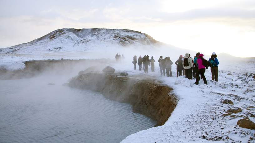 Tot slot nog een persoonlijke favoriet. Niet ver van Reykjavík, slechts gescheiden door de bergpas Hellisheidi, ligt het Hengillgebergte. Afhankelijk van het jaargetijde en het weer, is het ongeveer drie kwartier rijden. Vanuit het dorp Hveragerdi, dat sowieso een bezoek waard is vanwege het geothermische gebied en de goede pizzeria, rij je naar de zuidkant van het gebergte. Dit is een startpunt van de gemarkeerde wandelingen. Het leuke is dat je al met een half uurtje lopen bij de eerste stoompluimpjes komt en kleine kokende bronnetjes ziet. Als je verder loopt, worden de bergen wat serieuzer. Kortom: je kunt er stoppen om de benen te strekken, maar ook om een flinke dagwandeling te maken. Vanaf de noordkant kun je jouw wandeling ook beginnen, dan rij je richting de geothermische centrale Nesjavellir, waar ze dus onder andere de voorsteden van Reykjavík van warm water voorzien. Je kunt ook helemaal van noord naar zuid lopen of andersom, maar dan moet je alleen wel zorgen dat je terugkomt bij je auto, door bijvoorbeeld met twee auto’s te gaan of gewoon een rondwandeling te maken. Er zijn allerlei tochten mogelijk en allemaal voeren ze door zeer gevarieerd gebied. Je wandelt langs beekjes, groene waterkanten, watervalletjes en dus hete bronnen. Je kunt hier een bad nemen in een warme beek. In de zomer én in de winter, zoals wij tijdens ons bedrijfsuitje in 2012 hebben mogen ervaren met zijn allen. Wat een feestje!