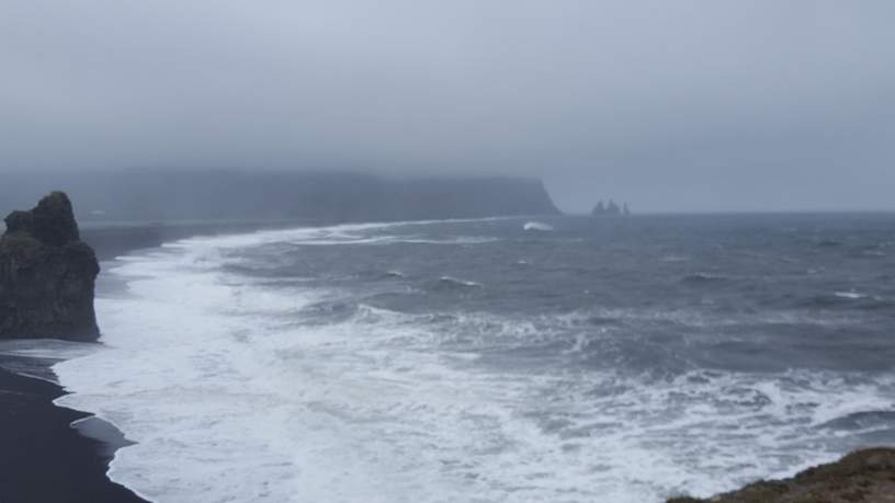De watervallen, Seljalandsfoss en Skogafoss, maken op iedereen indruk. Na de lunch gaan we op weg richting Dyrholaey en Reynisdrangar. De wind trekt weer flink aan. Als we op de kaap en later op het zwarte strand staan, zien we de woeste golven richting strand rollen. We hebben de regenpakken niet voor niets mee genomen, maar het deert niemand. In tegendeel. ‘We zijn op IJsland, niet in Spanje!’ hoor ik iemand zeggen. En zo is het maar net…