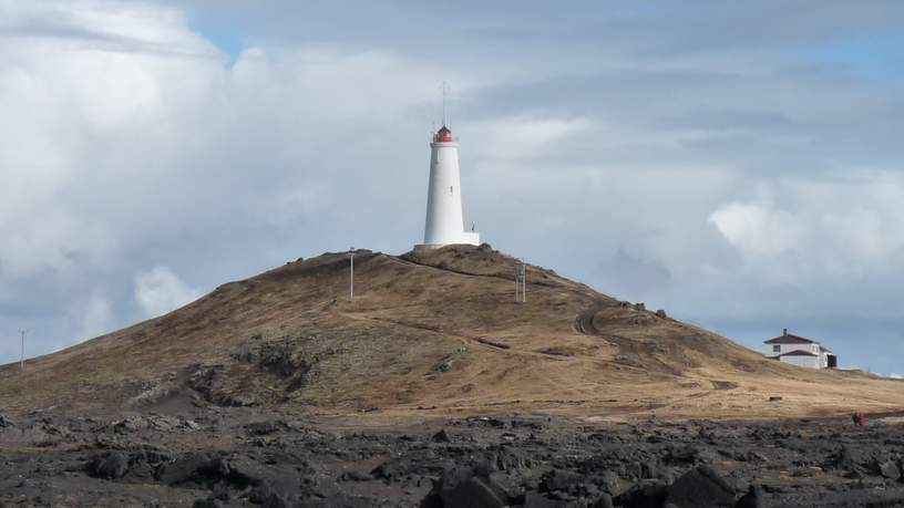 De statige witte vuurtoren van Reykjanesvítí staat trouw op wacht, om met haar licht de schepen veilig naar de haven te begeleiden.