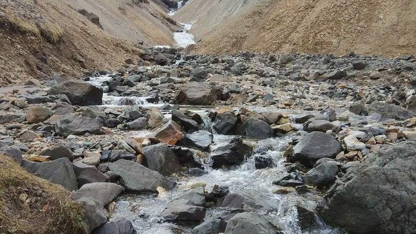 De volgende dag moeten we weer afscheid nemen van deze unieke plek. We maken nog een wandeling en pakken nog één keer een vergezicht mee. Op weg naar de bewoonde wereld stoppen we nog bij de kloof Innra Hvanngil. Na een korte wandeling over rotsen en keien kom je in de kloof uit waar water stroomt. We vullen ons flesje voor onderweg. De kloof is omgeven door basaltrotsen en bergen met verschillende kleuren zoals rood en blauw.