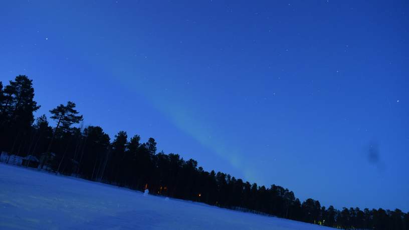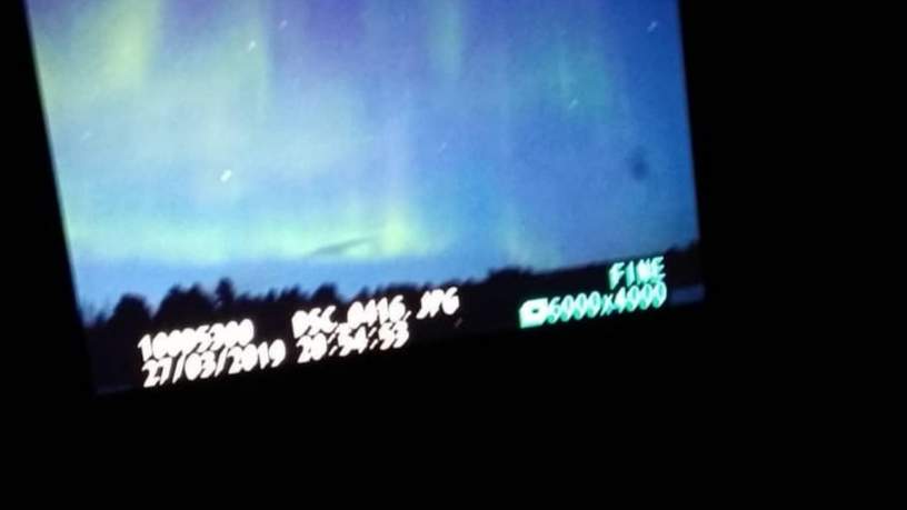 Nou zijn wij natuurlijk niet voor één gat te vangen en bovendien zijn we al eerder in Lapland geweest dus we weten dat het noorderlicht door de camera vaak eerder te zien is dan met het blote oog. Ik pak mijn mobieltje en maak wat foto’s en mijn collega zet haar camera op het statief. Op haar camera is nog niets te zien maar op mijn mobieltje wel.