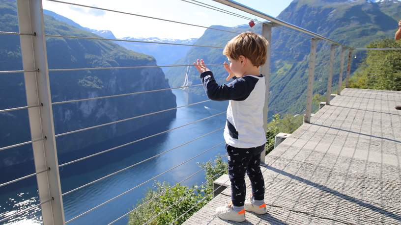 Vanuit Flåm maken we een spectaculaire boottocht met een RIB boot op het Aurlandsfjord. Voor Olivier hebben ze ook een klein thermopakje, handschoenen en een bril. Olivier vindt het allemaal prachtig en kijkt zijn ogen uit tijdens de tocht waarbij we met een flinke vaart over het fjord gaan. We zien zelfs zeehondjes aan de oever van het fjord liggen. De excursie combineren we met een wandeling naar een geitenboerderij in de bergen. De thermopakken laten we achter bij de boot en Olivier gaat in de rugdrager. We laten het fjord achter ons en genieten onderweg nog van de mooiste uitzichten op het fjord. Een ideale excursie voor gezinnen.