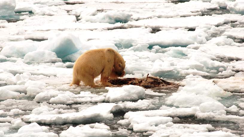 De lezingen aan boord hebben zeer uiteenlopende onderwerpen. De eerste gaat over het verontrustende feit dat het pakijs zich steeds verder terugtrekt, waardoor het voor ijsberen steeds lastiger wordt om voldoende voedsel te vinden. Ze moeten ieder jaar zo’n 50 tot 60 zeehonden zien te verorberen om te kunnen overleven. Ik merk al snel dat het zien van ijsberen een kwestie van geluk is. Het is zoeken naar een speld in een hooiberg en er is geen enkele garantie dat we ze ook vinden. Het schip moet zich een weg weten te vinden tussen het een tot twee en een halve meter dikke drijf-ijs naar uiteindelijk het drie tot acht meter dikke pakijs waar de ijsberen zijn. Overal waar je kijkt, is het landschap hetzelfde. Hier bevind je je in een ijzig witte wereld van water, ijs en mist.