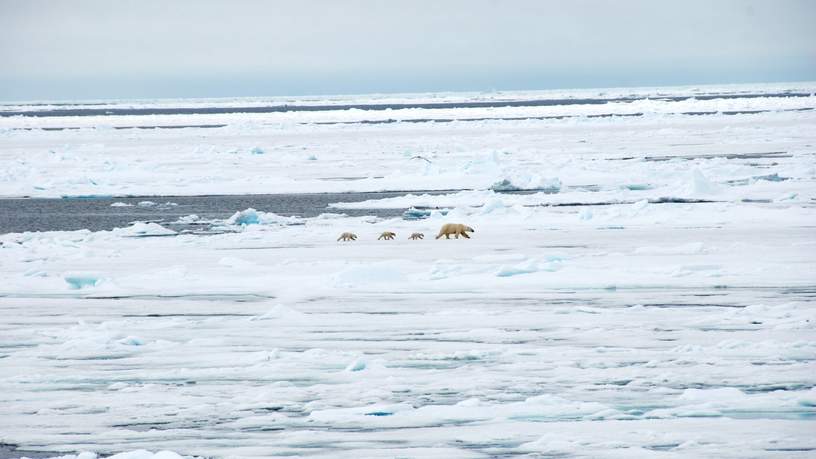 De volgende dag hebben we alweer geluk! Eerst zien we een moeder beer met twee jongen en even later wordt er een moeder beer met drie kleintjes gevonden. Ze is wat schuw en erg beschermend naar haar kroost. De kapitein is in alle staten want in al zijn 23 jaar dat hij op Spitsbergen vaart heeft hij dit nog nooit gezien. Weer geluk dus. Hierna wordt het erg mistig en verlaten we het pakijs. We zetten koers richting de Hinlopen Straat.