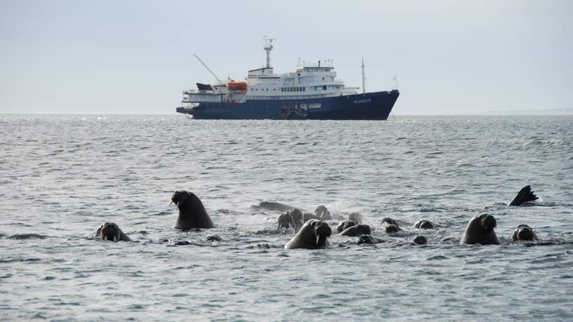 De volgende dagen maken we diverse landingen, het is heerlijk om ook weer even in beweging te komen. De wandelingen worden onderverdeeld in makkelijk, gemiddeld en wat zwaarder, je kunt zelf bepalen aan welke wandeling je deelneemt. Ze zijn allemaal even interessant, vanwege de uitzichten, het bijzondere landschap en de rendieren die we zomaar tegenkomen. En we hebben weer geluk, we treffen een grote groep walrussen aan. Ze zijn grappig, nieuwsgierig, hebben lange tanden en met hun logge lichaam zijn ze komisch en heel sterk. We lopen over de permafrost waar in de ontdooide bovenlaag slechts kleine bloemetjes groeien. De bodem is zacht en af en toe zak je weg.
