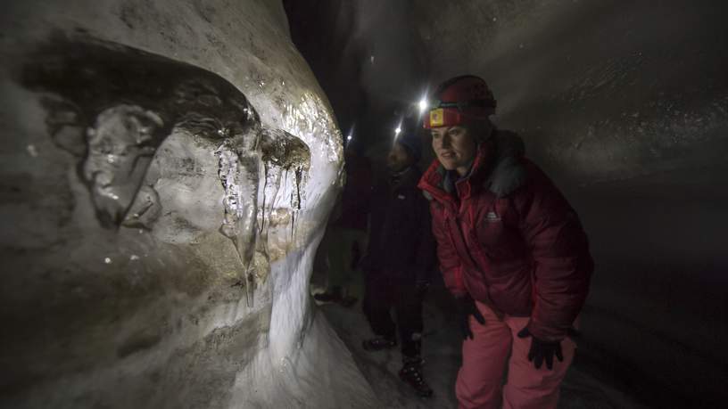 Onderweg hebben we weer veel rendieren gezien en een ijsgrot bezocht. Indrukwekkend om onder een gletsjer door te lopen. We kropen door een gat in de berg via een ladder naar beneden, onze hoofdlampen aan, want het was stikdonker. Je kon letterlijk geen hand voor ogen zien. Beneden aangekomen liepen we over een rivierbedding die ‘s zomers vol water staat, maar in de winter bevroren is. Wát een ijsmassa van pegels, blokken en muren waarlangs het water groeven had uitgesleten. Het leek net het patroon van baleinen van een walvis. Je kon wel 20 meter omhoog kijken en we zagen prachtige kristalkleuren. De rots- en zandsedimenten van de gletsjer waren in het ijs goed te zien. Zo zijn we zeker 150 meter door de gletsjergrot gelopen. Teruggekomen op ons Basecamp hebben we de honden bevrijd van hun tuig en weer aangelijnd bij hun hok. En ze bedankt natuurlijk voor hun harde werken. Ik heb thuis mijn handschoenen wel twee keer moeten wassen voordat ik de geur van de honden eruit had.
