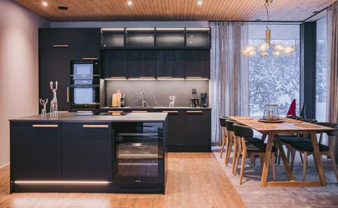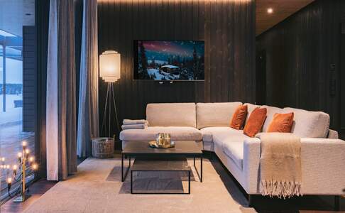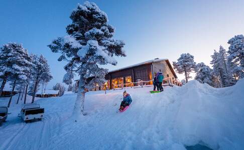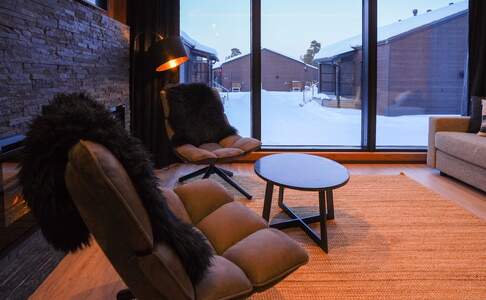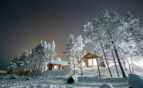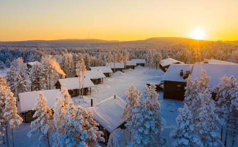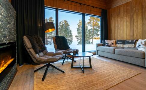 Inari Arctic ChaletsDeze 20 nieuwere huisjes zijn geschikt voor twee volwassenen en twee kinderen. Het huisje heeft één slaapkamer met een groot tweepersoonsbed. De luxe badkamer met douche heeft ook een privé sauna. Een kleine keuken is aanwezig. De woonkamer is sfeervol ingericht met een haard, panorama ramen en een sofabank, deze kan gebruikt worden als sofa bed voor twee kinderen.