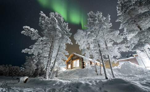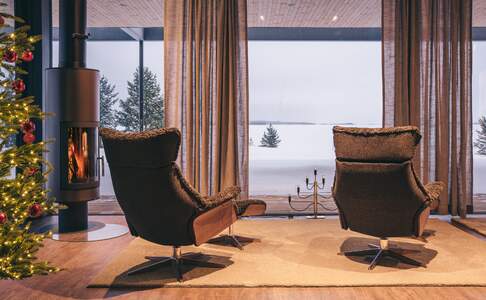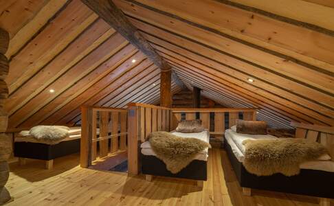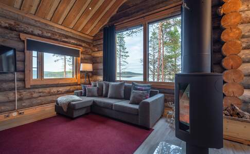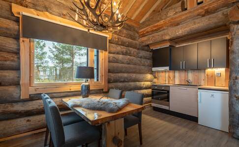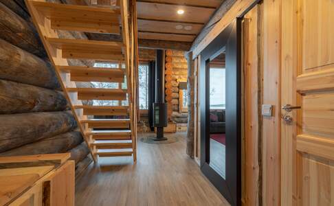 Log CabinsDe log cabins liggen aan het Inari meer of aan de Nukkumajoki rivier, niet ver van het hoofdgebouw. Deze blokhutten zijn uit dikke houten balken opgetrokken en sfeervol ingericht. In het midden van de woonkamer is een houtkachel en hier heb je mooi uitzicht over het (bevroren) water. Je kan gebruik maken van een keuken met eettafel en er is een tv. De badkamer is ruim en je beschikt over een privé sauna. Er is een slaapkamer met een queensize bed en een slaapzolder met 3-4 bedden.