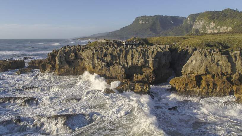 Via het Nelson Lakes National park rijden we vandaag naar Punakaiki. Nelson Lakes National park is een betoverend alpenlandschap met ruige bergtoppen, bossen, prachtige gletsjermeren en het begin van de ontzagwekkende Southern Alps. Onderweg maken we een stop bij het schilderachtige dorpje St. Arnaud, gelegen aan de oevers van Lake Rotoiti. Vervolgens slaan we af naar het binnenland om de Buller River Gorge te volgen, een van 's werelds beste maar minst bekende schilderachtige routes. De weg is door 19e eeuwse goudzoekers uit het bos gehouwen en volgt de diepe rivierkloof, waarbij we vaak over enkelbaans bruggen rijden. Wanneer we uit het bos komen, volgen we de weg langs de kustlijn in zuidelijke richting naar de kleine nederzetting Punakaiki. Punakaiki staat bekend om zijn wilde, ruige kustlijn en de beroemde 'Pancake Rocks'. Deze gelaagde kalkstenen stapels zijn een buitengewoon natuurmonument.